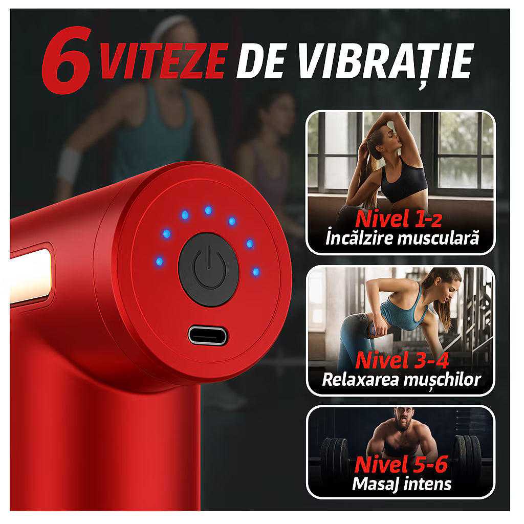 Începe cu viteza 1–2 și crește treptat, 1–2 minute pe zonă. Autonomie de până la 8 ore și încărcare Type-C pentru utilizare oriunde. Evită presiunea pe articulații.