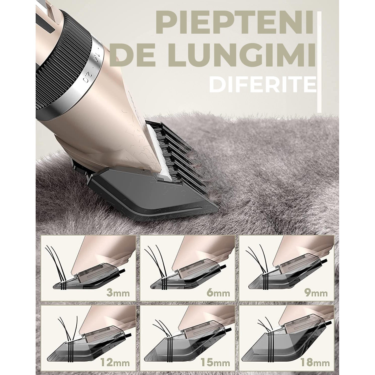 O mașină de tuns gândită pentru control și confort: fără fir, cu 2 viteze, zgomot redus (~60 dB) și 6 capete + ghidaje 3/6/9/12 mm. Potrivită pentru câini, pisici, ovine și bovine.