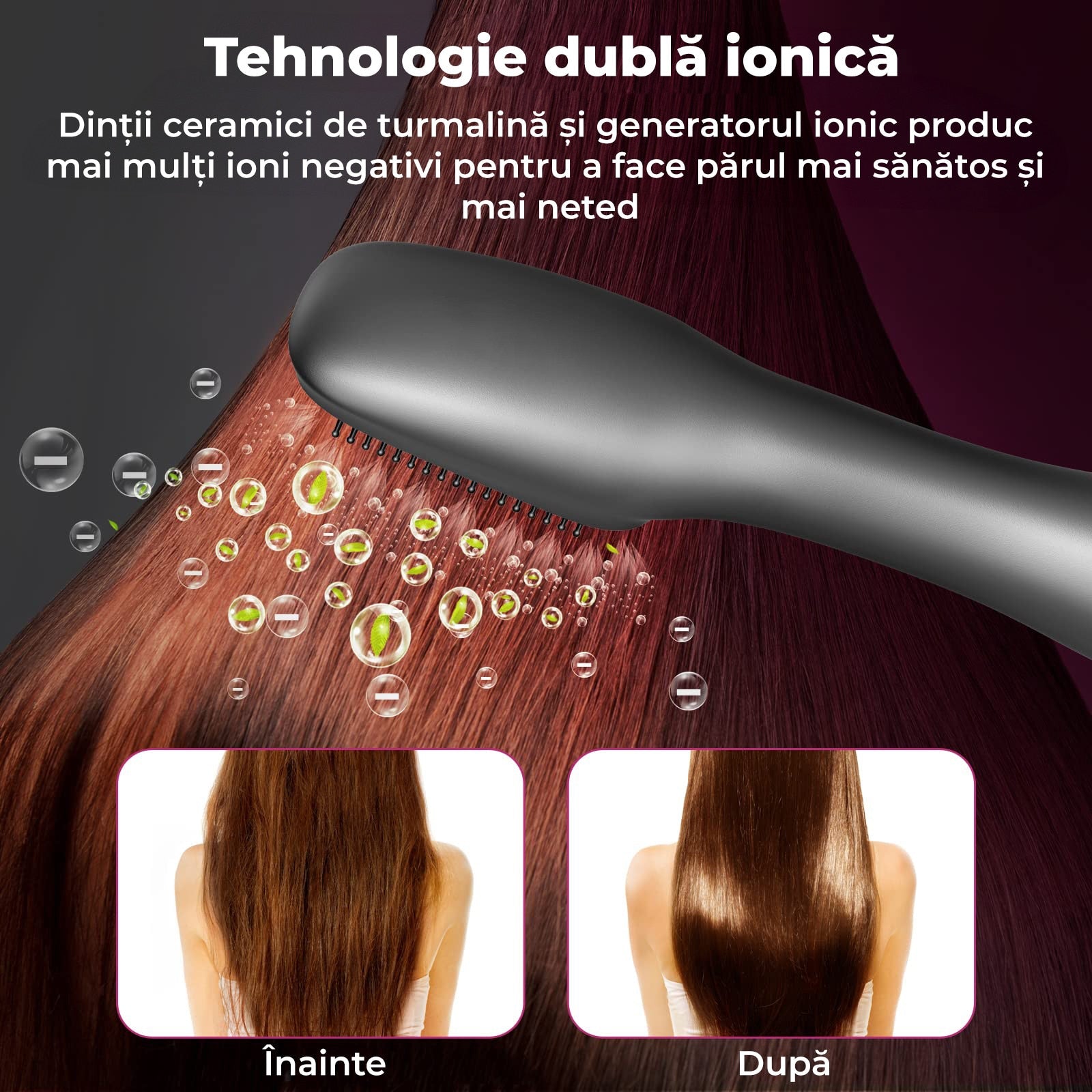 Suprafața cu turmalină ceramică susține o distribuție mai echilibrată a căldurii, iar ionizarea negativă ajută la reducerea electrizării și a aspectului de frizz.