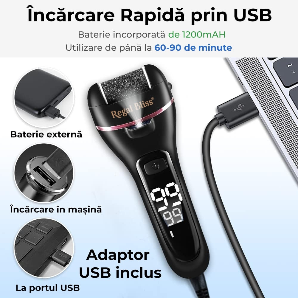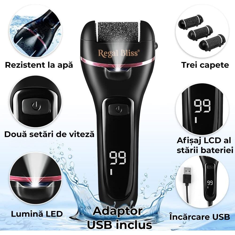 Pila electrică Regal Bliss® îndepărtează rapid pielea îngroșată, lăsând călcâiele fine și netede – fără durere și fără vizite costisitoare la salon.