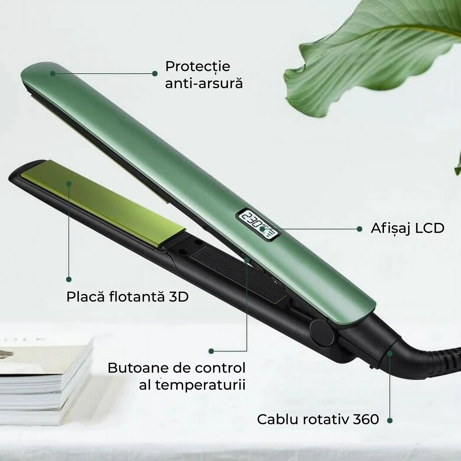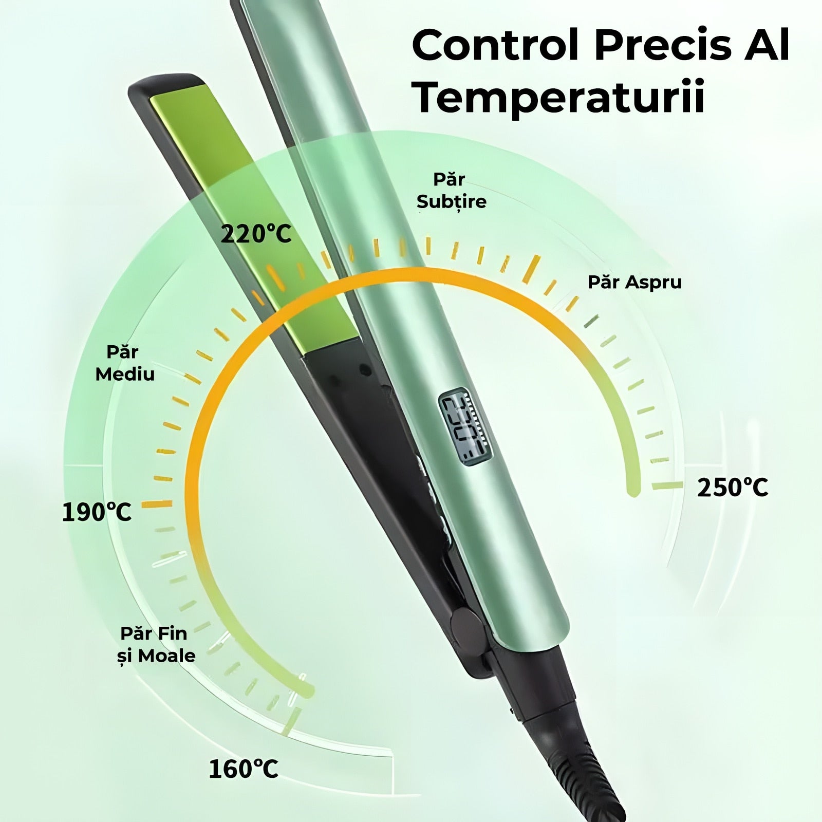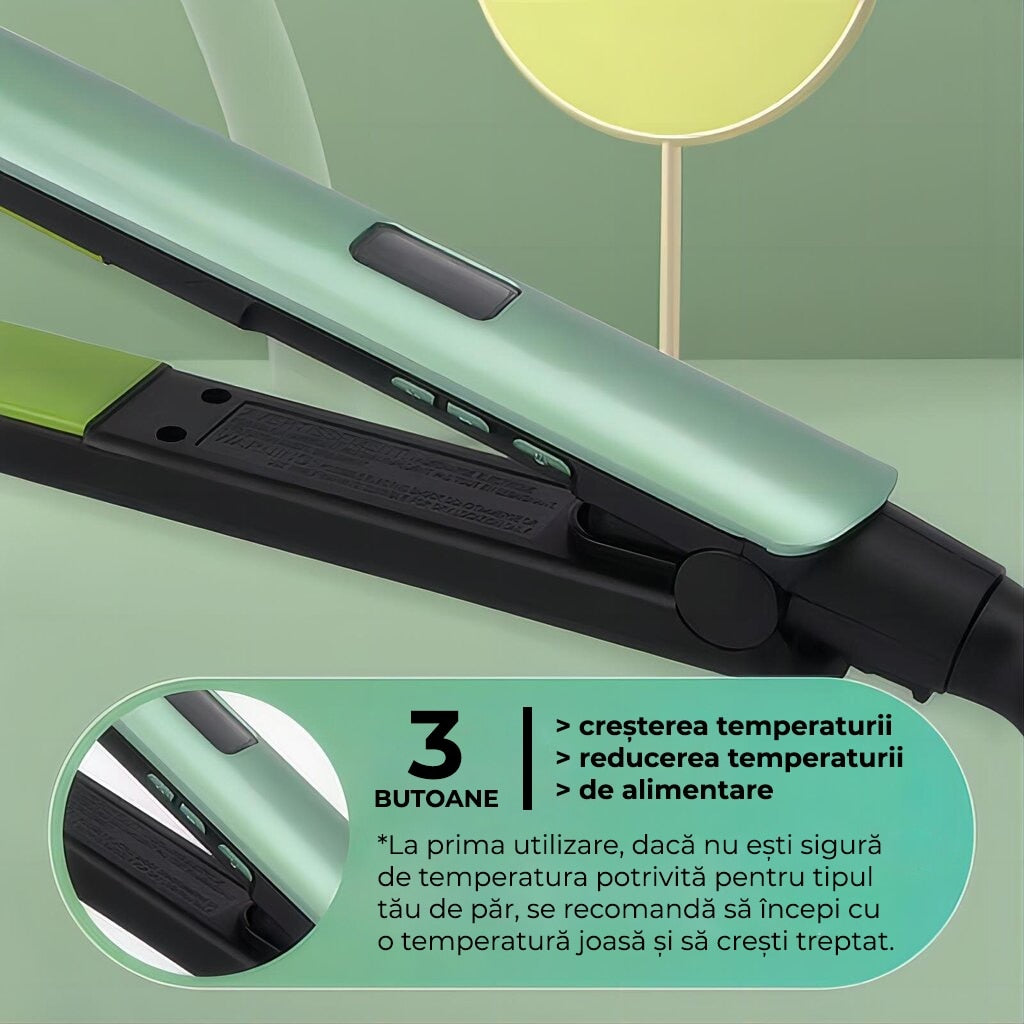 Reglaj între 160°C – 230°C, adaptat fiecărui tip de păr.